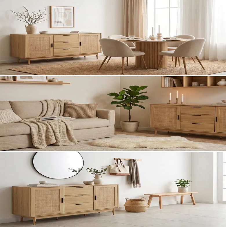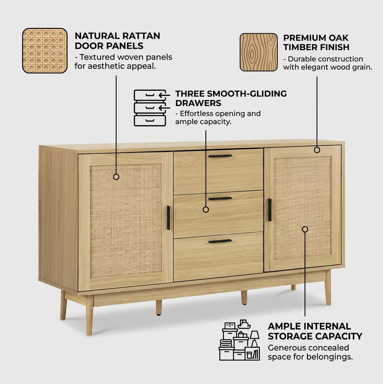 Unlike low-quality options, the Artiss Rattan Buffet combines a premium Briony Oak timber-look finish, natural rattan accents, and sturdy construction. It’s designed to last while providing smart, stylish storage that transforms your home.