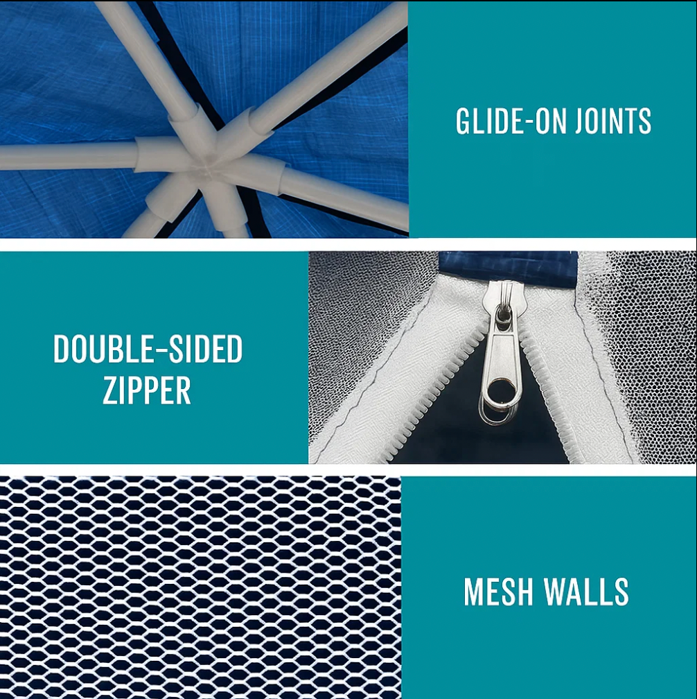 The Velcro attachment system allows two people to set up in under 15 minutes with no tools. Packs down neatly for quick transport and storage.